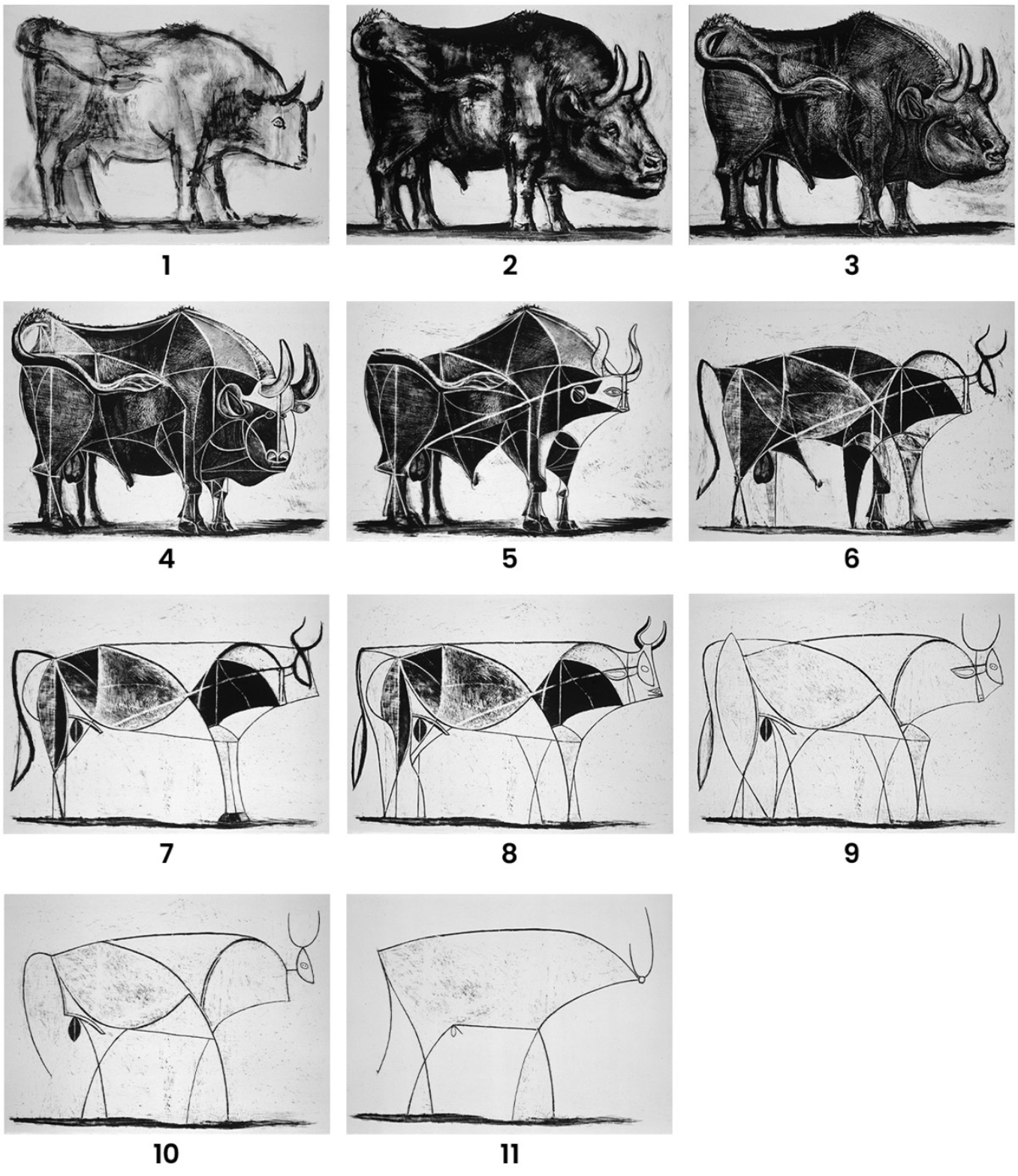 比如,毕加索最著名的绘画之一,毕加索的公牛,就给我们展示了提纯过程的生动一课。这是他为研究公牛的基本形式而绘制的一系列图像。