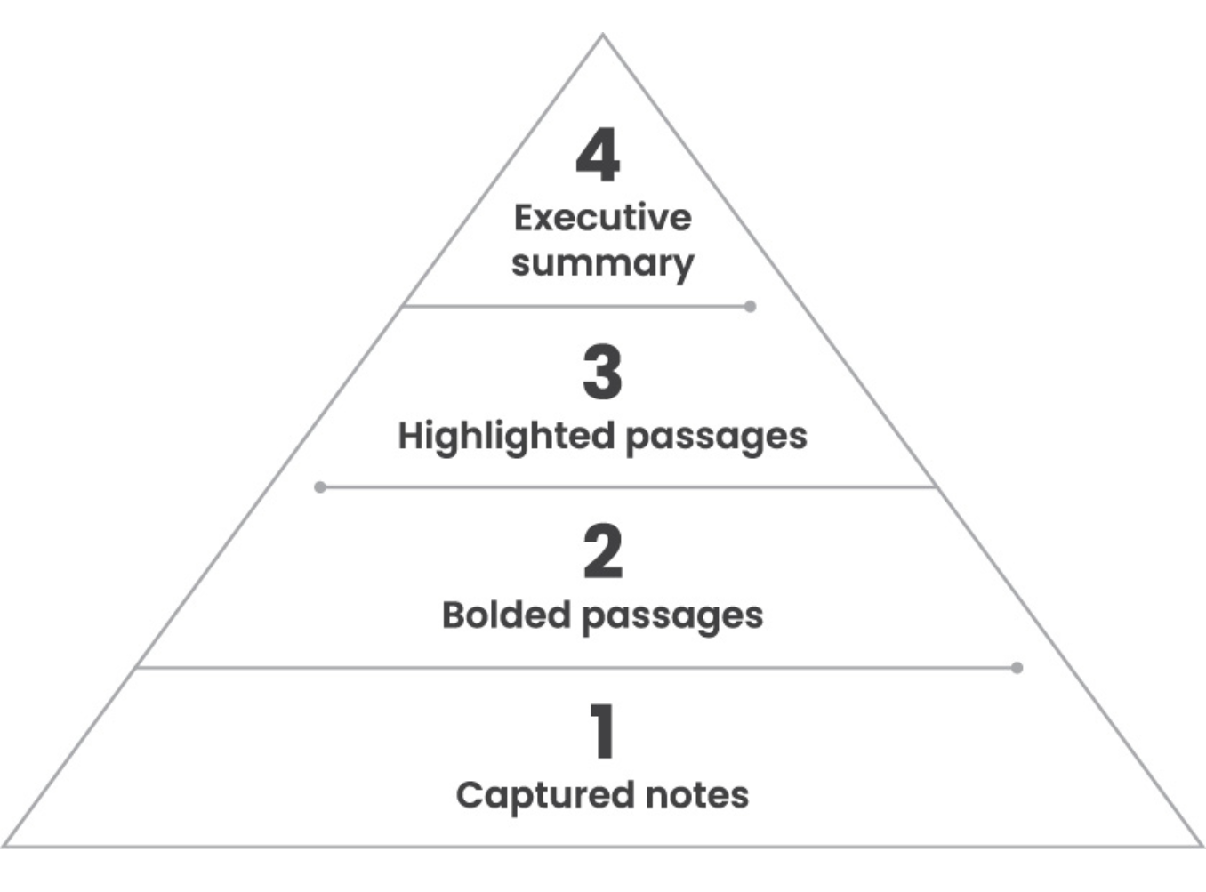 本书介绍了一种更好用的划重点的方法,叫做「渐进式总结」,或者称为金字塔形总结方式。