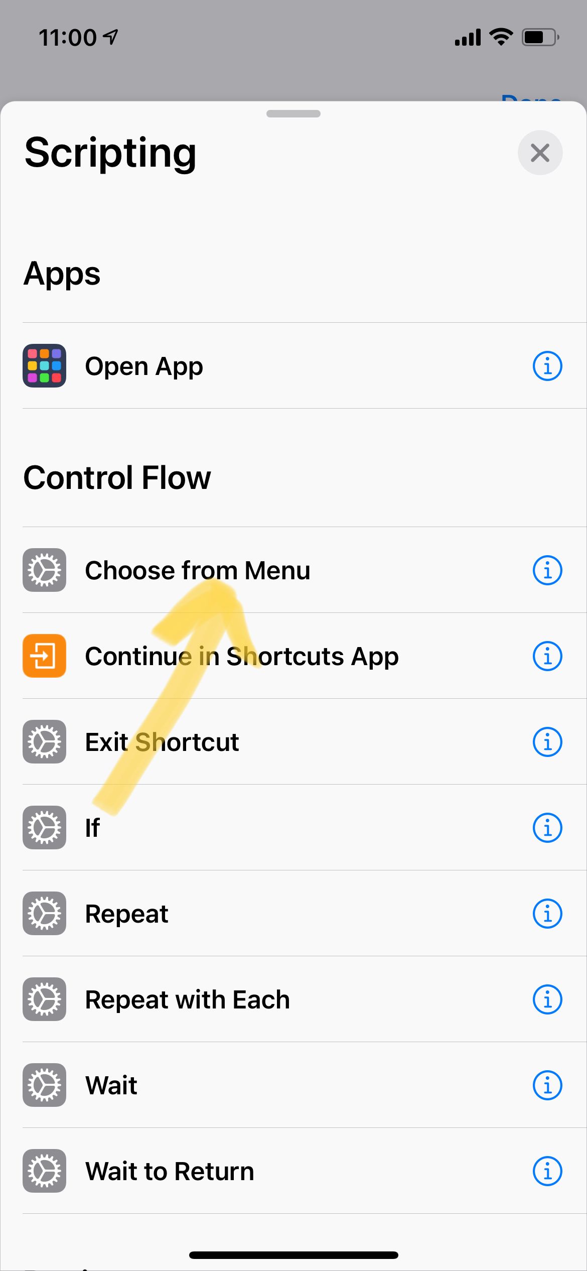 - 首先还是创建快捷方式,但是选择指令的时候我们从“脚本”这个类别中找到“从菜单中选择”这个指令