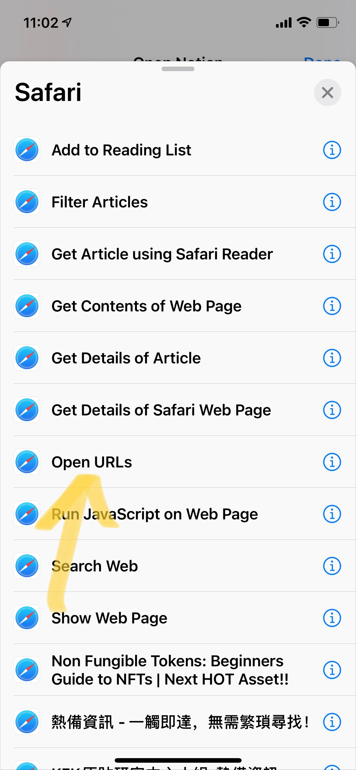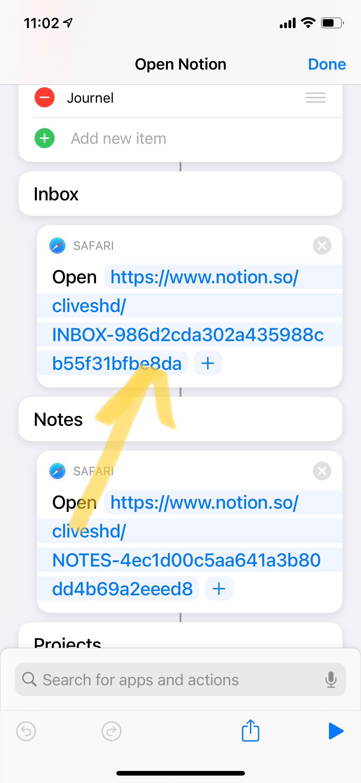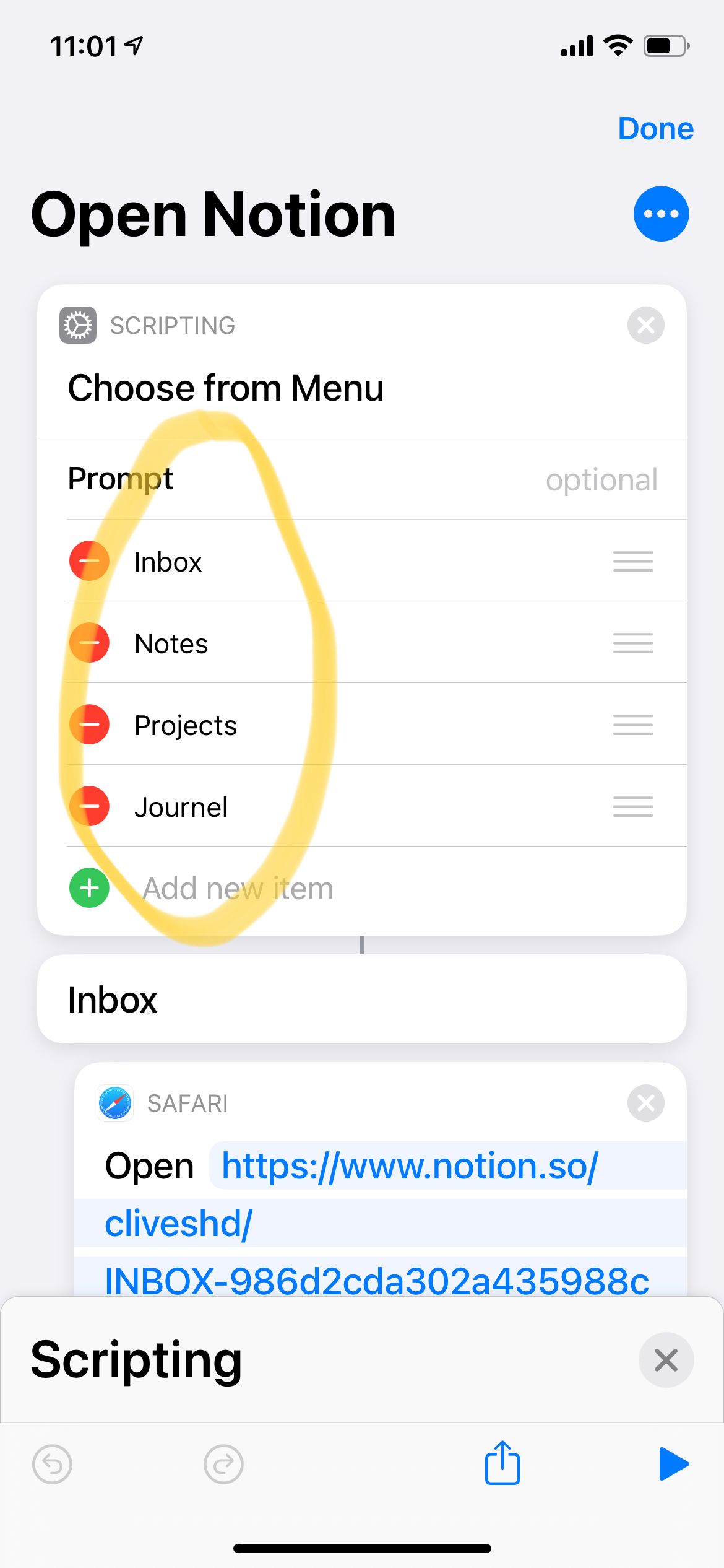 这个快捷方式启动后会弹出菜单,可以选择我常用的Notion笔记。在这个例子里面有两个很有用的指令,一个是“从菜单中选择“,点击后能够弹出个性化的菜单,根据不同选择进行不同的动作;另一个是“打开链接”,不管是网页链接,还是Notion的页面链接,还是音乐播放器的链接都可以复制进去,实现一键开启。