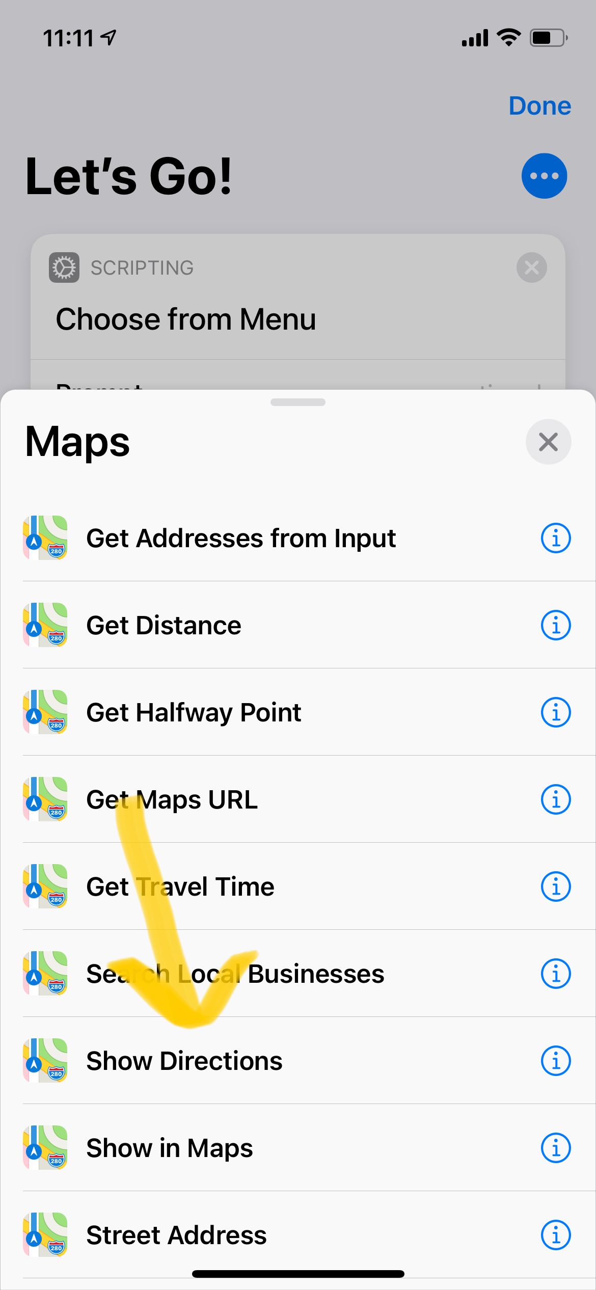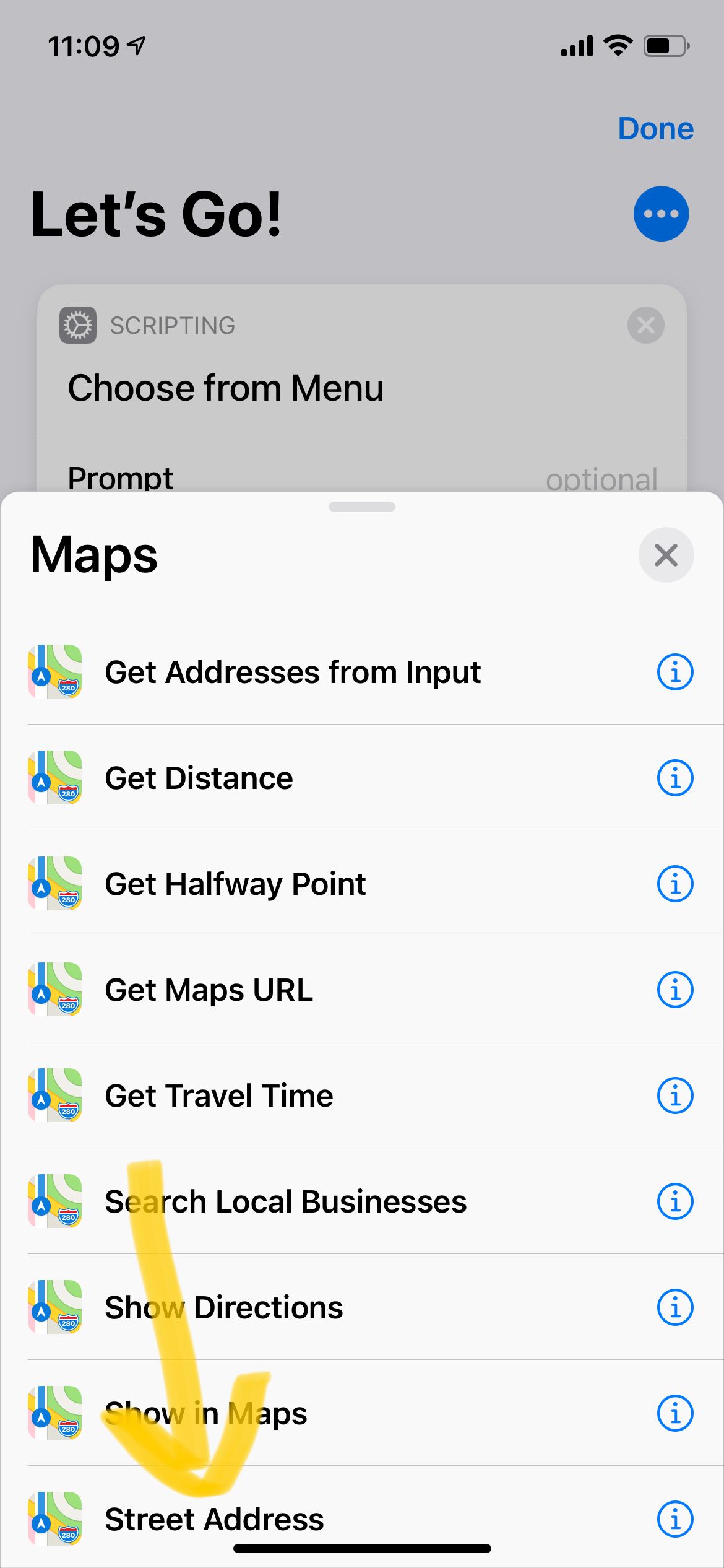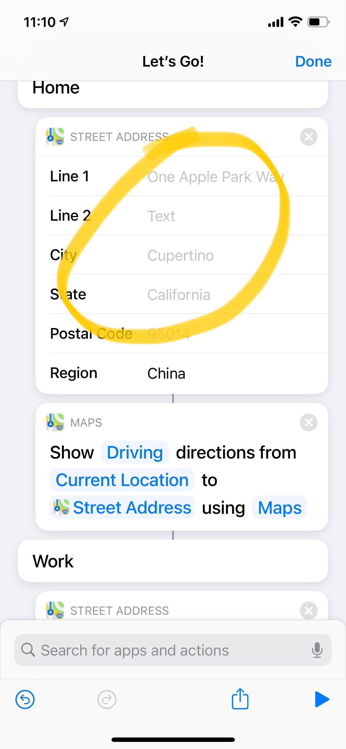 这个例子中我仍然使用菜单,弹出我的常用地点,获取导航路径。根据需要,添加的指令变为“获取地址”和“导航”。当使用地图功能的时候,有一点比较奇怪,就是如果直接使用“导航”指令,输入的某些地址会无法正常解析,比如去往单位的路径可能会解析成其他省份的地点。所以,最好在导航前面加入“获取地址”的指令,准确输入你的常用目的地地址,这样导航起来就十分的准确了。