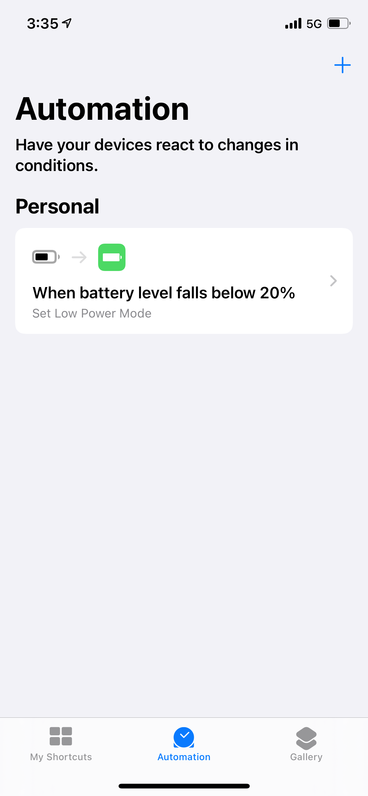 捷径中的“自动化”功能也十分有用,我目前定义了一个“当电池电量不足20%的时候,自动开启节能模式”的自动化方案,因为外出过程中苹果手机电量真的消耗很快,这个自动化方案聊胜于无吧。如果在家庭中还有其他智能家居产品,使用自动化还可以实现整体联动,打造更多丰富的功能。