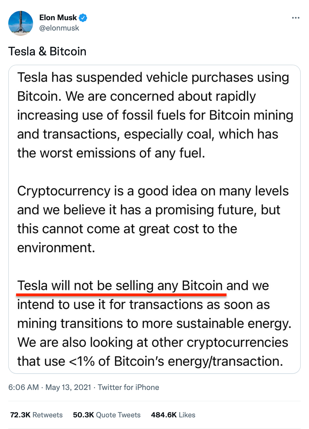 还记得Elon Musk曾多次在Twitter上表示自己绝对不会出售比特币,打脸来的太快!