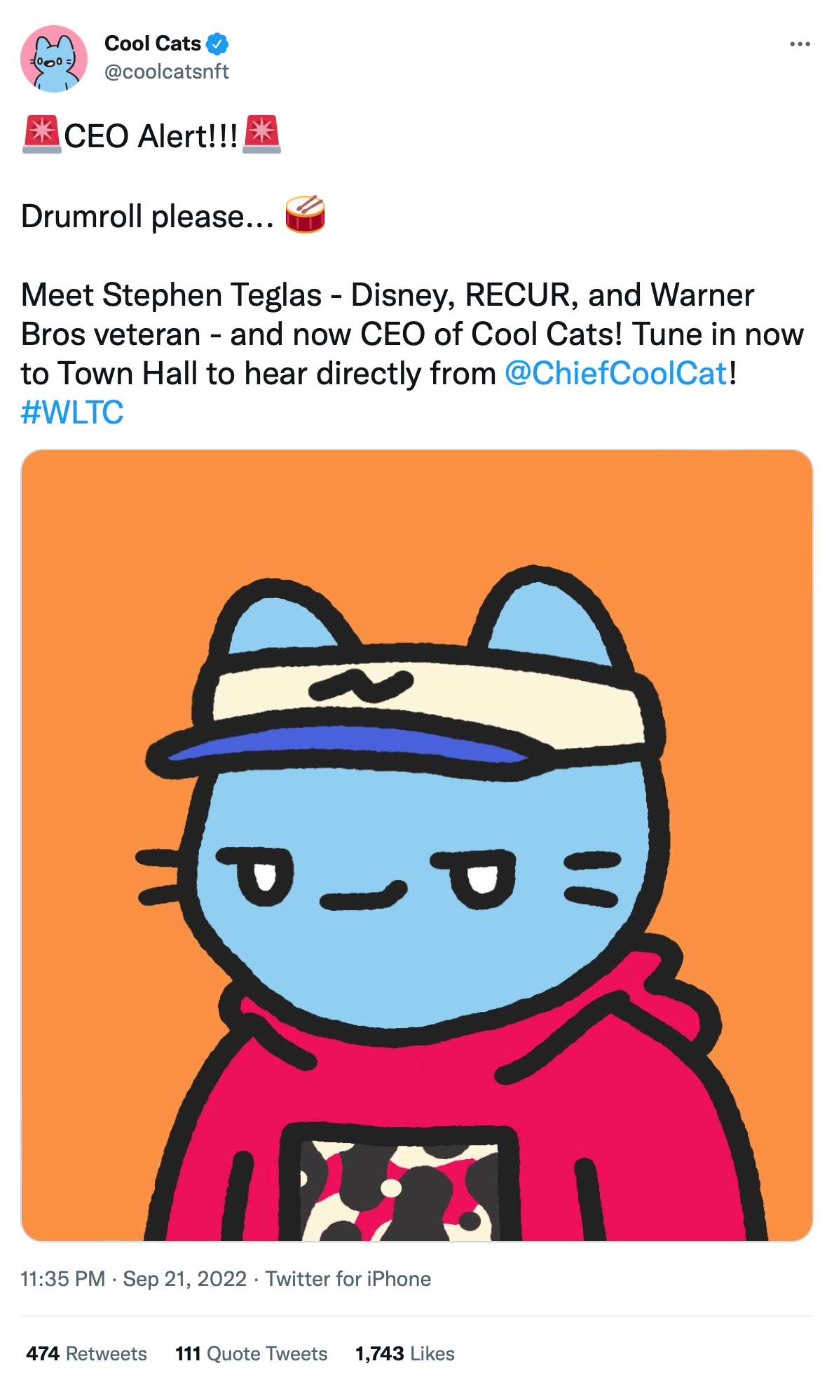 本周,Cool Cats团队宣布Stephen Teglas将担任首席执行官。