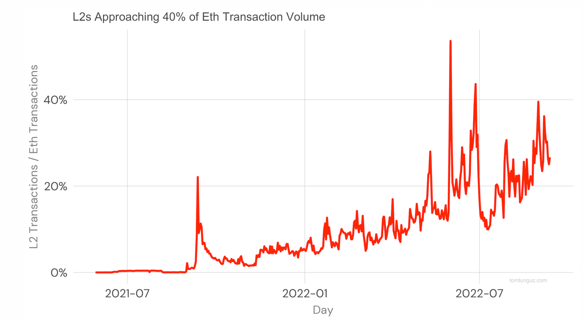 - L2(Arbitrum & Optimism)占以太坊所有交易的30-40%,但仅消耗总Gas费用的2%。