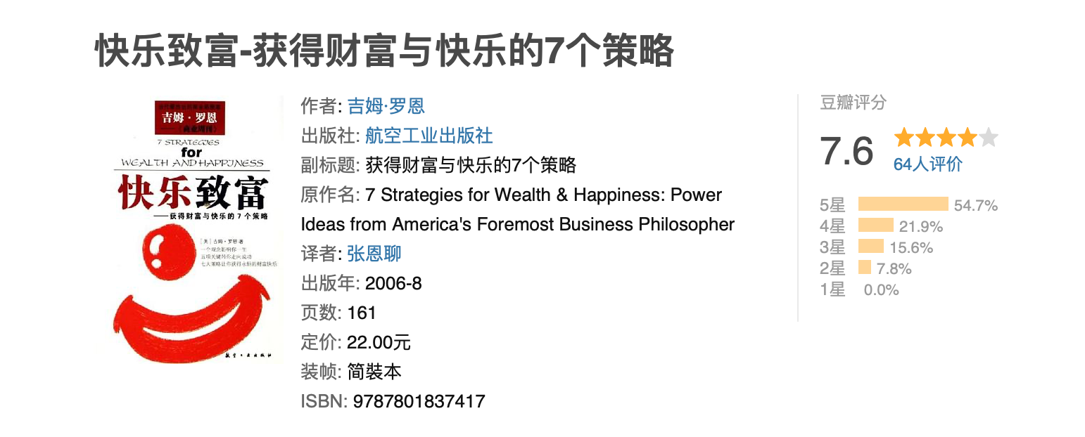 我天然被励志类内容吸引,又喜欢刨根问底。搜集周刊内容时认识了吉姆·罗恩(Jim Rohn),读了他的代表作《快乐致富》,没想到竟然挖到宝藏。