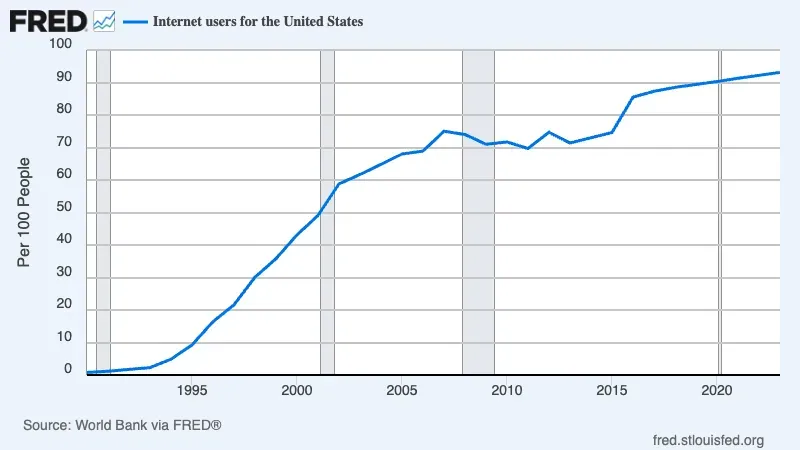 为什么这样的故事如今看起来比过去更普遍?原因之一在于,网络效应并非互联网独有,但互联网让它们更容易出现。而互联网真正普及,也只是从 2000 年代开始: