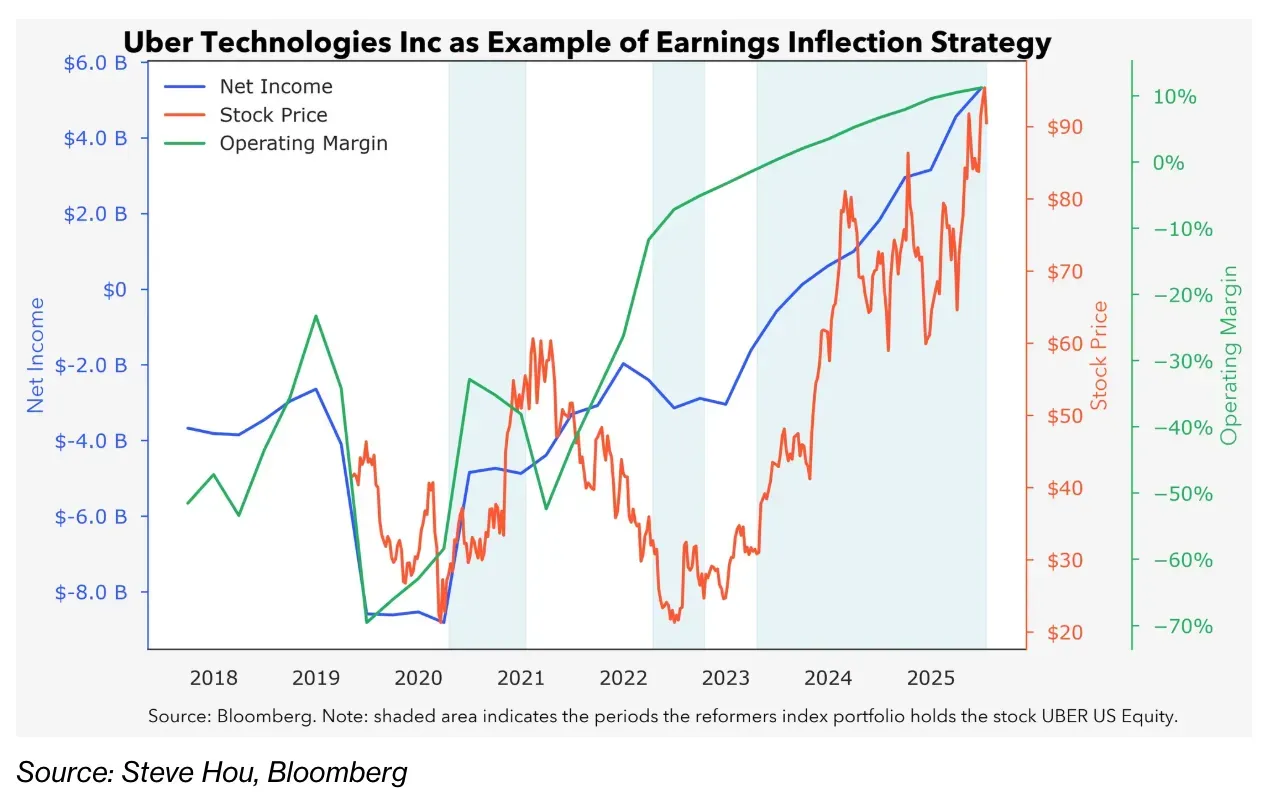 在这个高度简化、风格化的模型中,“屎化”是一次性发生的——价格突然跳升。现实世界中,这一过程当然可能更为渐进、也更隐蔽:那种冷酷无情或许是悄然逼近,而非一次性暴露出来。另一方面,我对彭博社《Odd Lots》周二关于 Uber 的讨论印象很深;而 Uber 实现盈利的转折,确实相当突然: